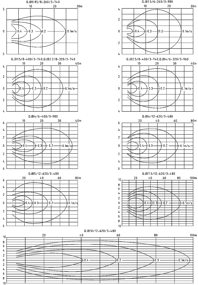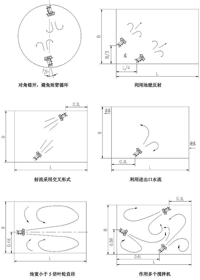 潛水攪拌機的選型是一項比較復雜的工作,選型的正確與否直接影響設備的正常使用,作為選型的原則就是要讓攪拌機在適合的容積里發(fā)揮充分的攪拌功能,一般可用流速來確定。根據(jù)污水處理廠不同的工藝要求,攪拌機最佳流速應保證在 0.15~0.3m/s 之間,如果低于 0.15m/s 的流速則達不到推流攪拌效果,超過0.3m/s 的流速則會影響工藝效果且造成浪費。所以在選型前首先確定潛水攪拌機運用的場所,如:污水池、污泥池、生化池;其次是介質(zhì)的參數(shù),如:懸浮物含量、粘度、溫度、PH 值;還有水池的形狀、水深等。