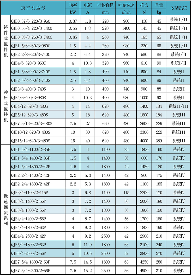 潛水攪拌機是引進德國潛水電機密封技術研制成功的。經(jīng)過多年的實踐摸索,因其在形式、結(jié)構(gòu)和試驗方法上的創(chuàng)新,使得潛水攪拌機總體性能達到了國外同類產(chǎn)品的水平。QJB 型潛水攪拌機可分為混合攪拌和低速推流兩大系列?;旌舷盗袛嚢铏C適用于污水處理廠和工業(yè)流程中攪拌含有懸浮物的液體;低速推流系列攪拌機適用于工業(yè)和城市污水處理廠曝氣池,其產(chǎn)生低切向流的強力水流,可用于循環(huán)及硝化、脫氮和除磷階段創(chuàng)建水流等。