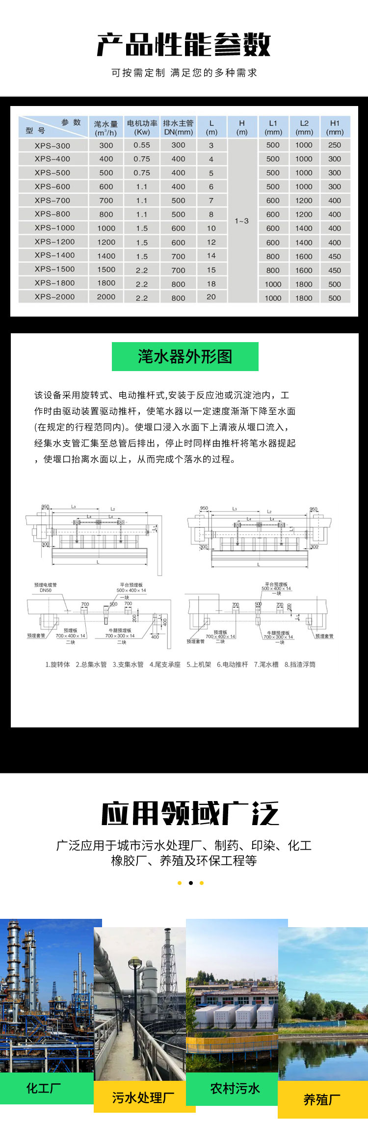 旋轉式水器主要用于在排水期開始筆水 ,水器一般停在池內最高水位的上部。水槽在驅動裝置的驅動下緩慢下降(與下降水同步)開始港水,水經(jīng)港水槽、支管、主管源源不斷地流出。當港水槽下行至預定深度時,驅動裝置開始反轉,筆水器快速返回至最高位置等待下一個命令。