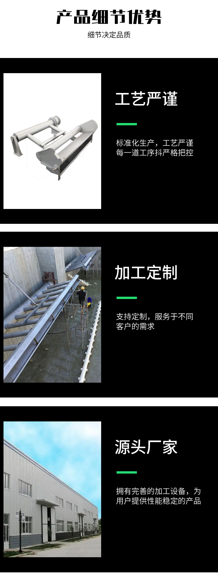 工作原理 旋轉式水器主要用于在排水期開始筆水 ,水器一般停在池內最高水位的上部。水槽在驅動裝置的驅動下緩慢下降(與下降水同步)開始港水,水經(jīng)港水槽、支管、主管源源不斷地流出。當港水槽下行至預定深度時,驅動裝置開始反轉,筆水器快速返回至最高位置等待下一個命令。 潷水器外形結構 潷水器是SBR(序批式活性污泥法)工藝中最關鍵的機械設備之一。它分為旋轉式、堰門式、虹吸式及浮簡式來控制排水。目前在國內應用廣泛的多為旋轉式。水器在一些污水處理中有著不可替代的作用。