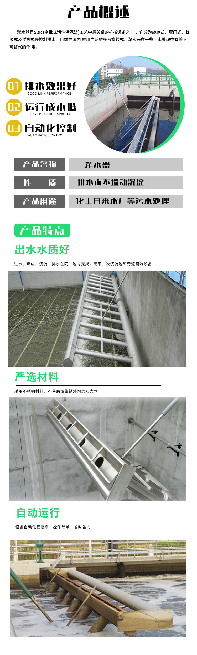 潷水器是SBR(序批式活性污泥法)工藝中最關鍵的機械設備之一。它分為旋轉式、堰門式、虹吸式及浮簡式來控制排水。目前在國內應用廣泛的多為旋轉式。水器在一些污水處理中有著不可替代的作用。