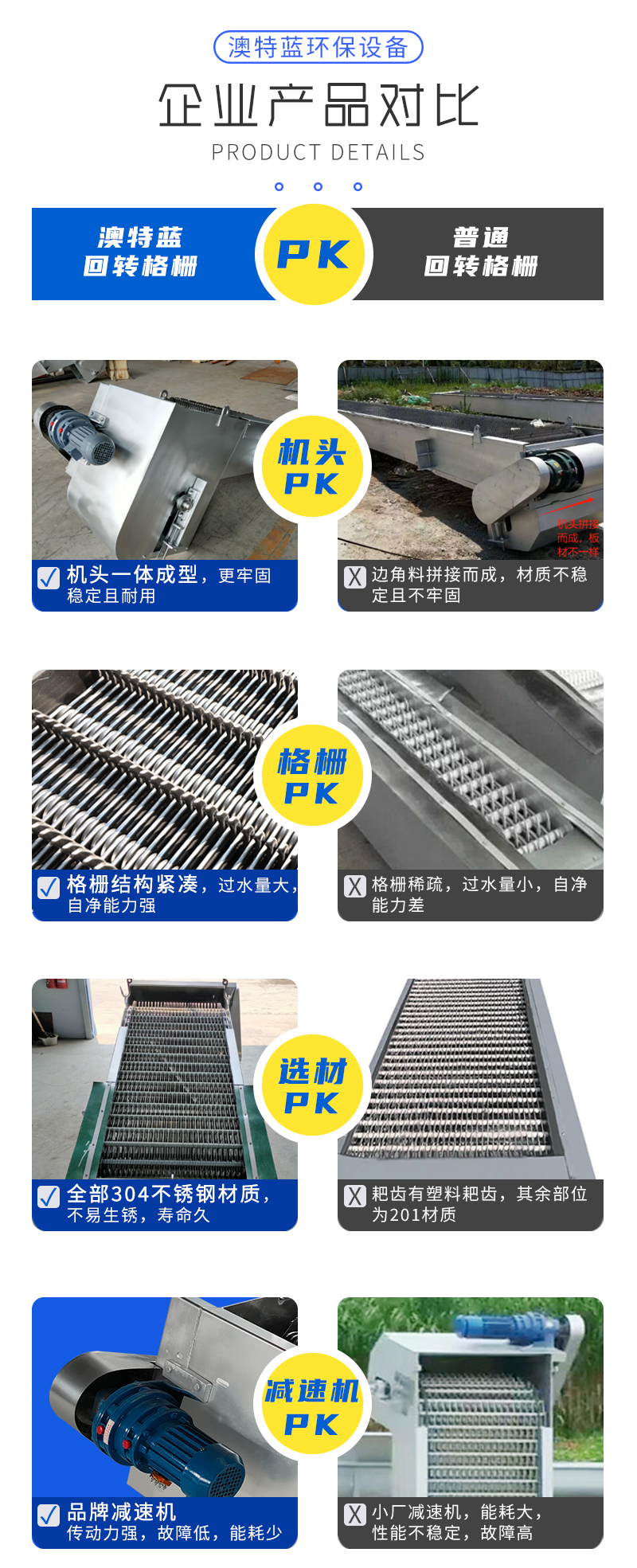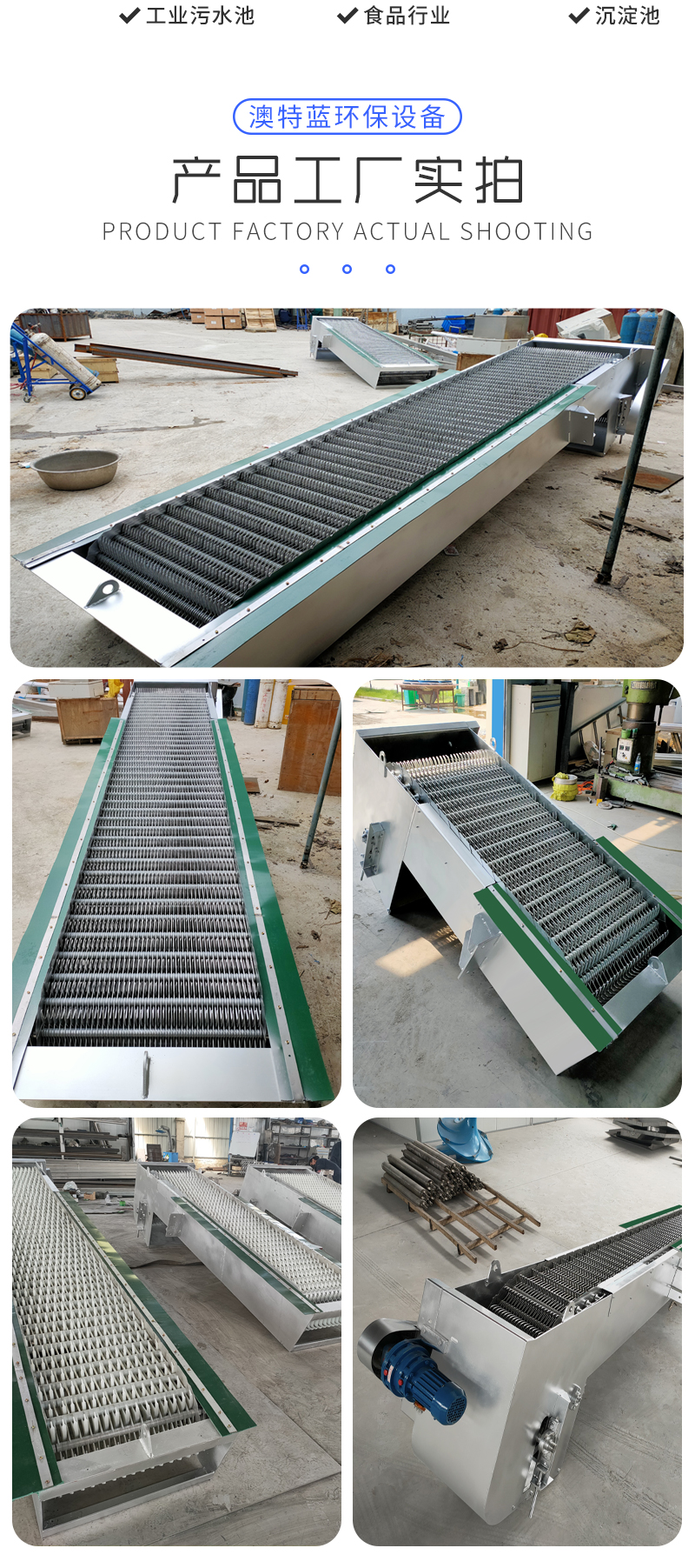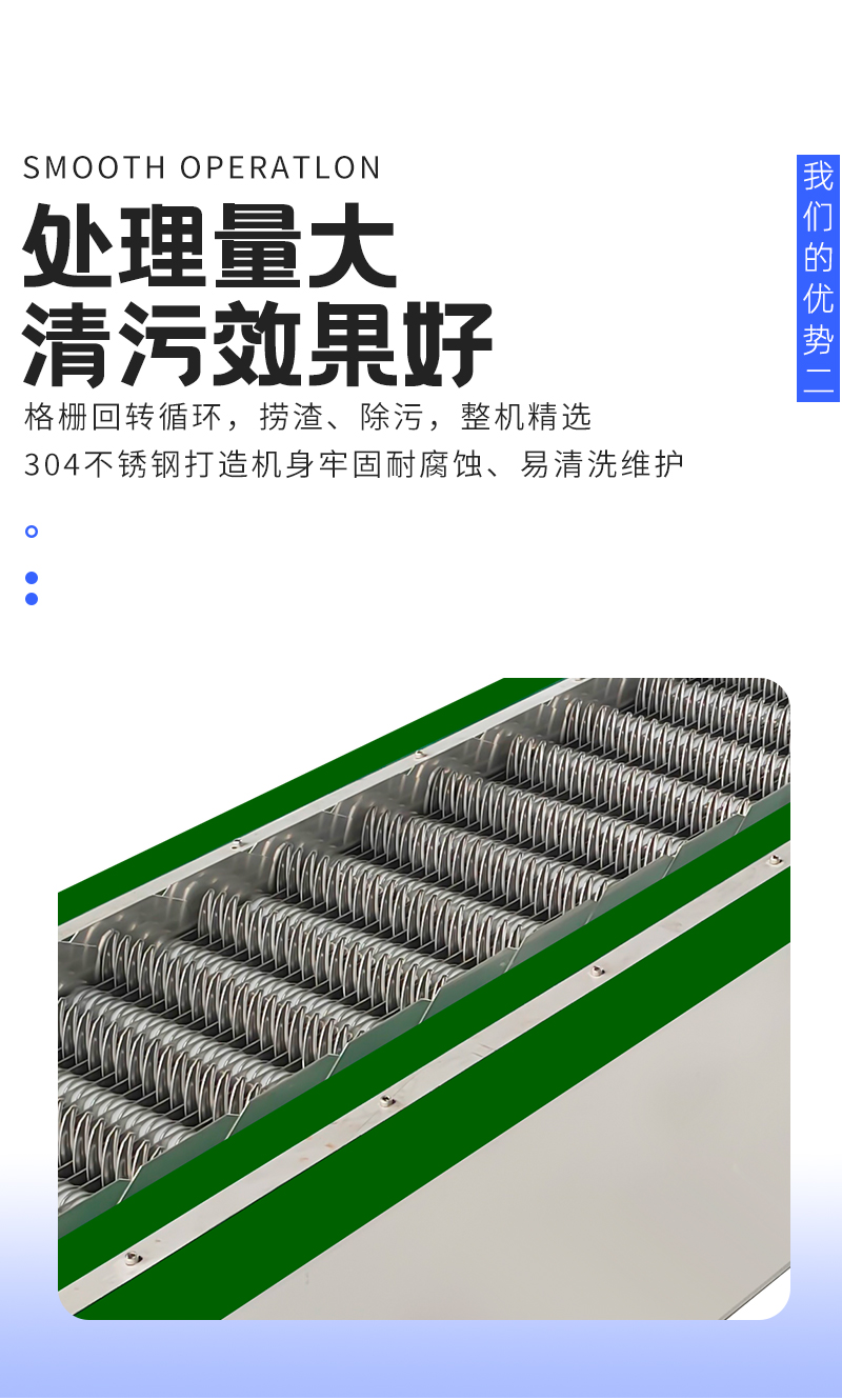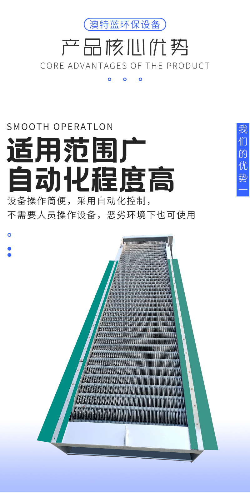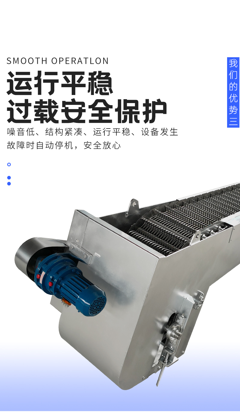 3、由于格柵機(jī)回轉(zhuǎn)鏈配帶多個除污齒耙,使得除污效率高,清污徹底;