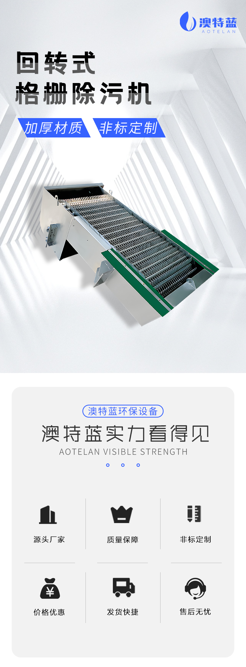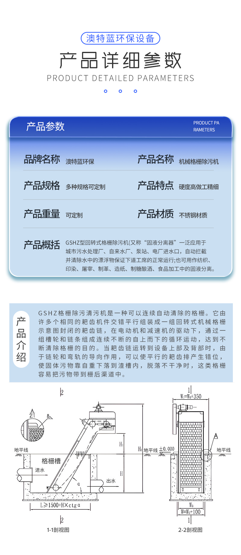 GSHP 型回轉(zhuǎn)耙式格柵除污機(jī)主要由驅(qū)動裝置、機(jī)架、主軸、柵條、托渣板、齒耙及牽引鏈組成。