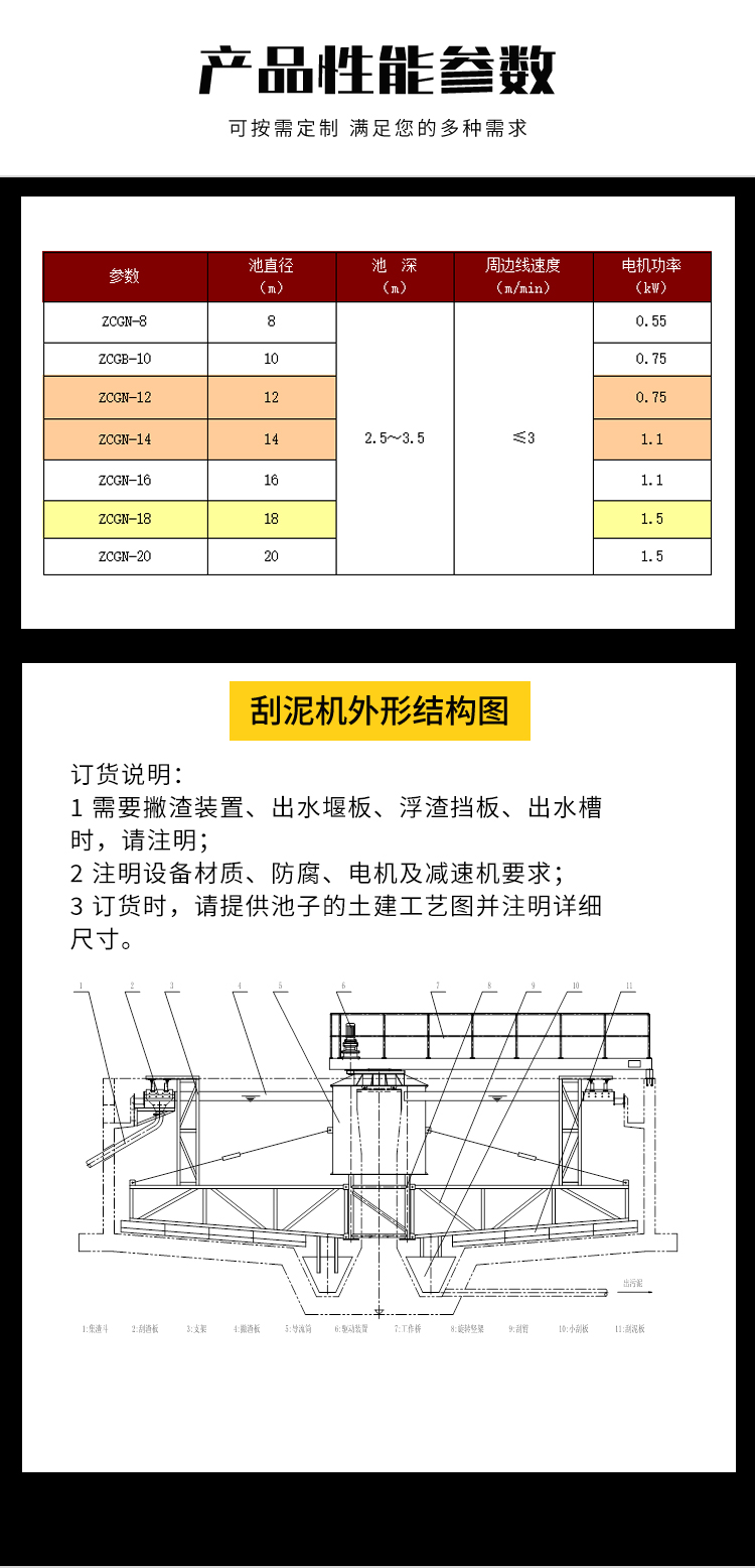 1 需要撤渣裝置、出水堰板、浮渣擋板、出水槽時,請注明;