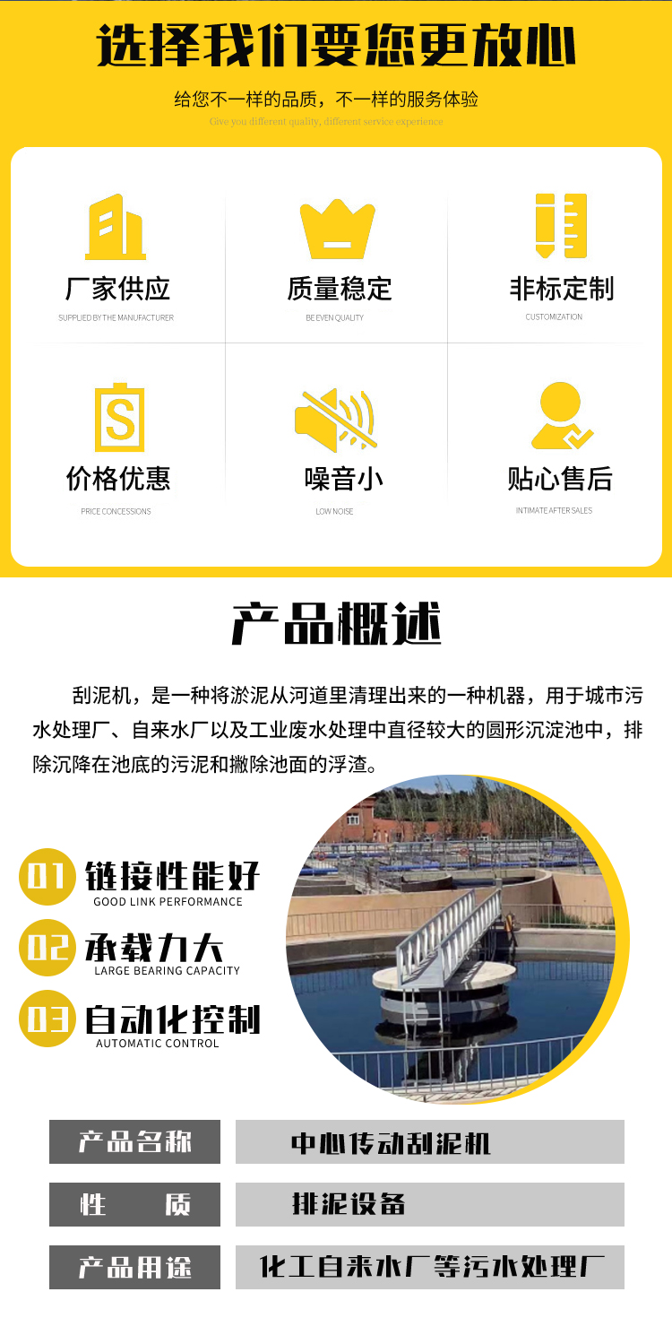 ZCGN 型中心傳動垂架式刮泥機(jī)多用于污水處理廠圓形沉定池,將沉降在池底的污泥刮集至集混池面的浮渣撇向集渣斗,以便進(jìn)一步處理。