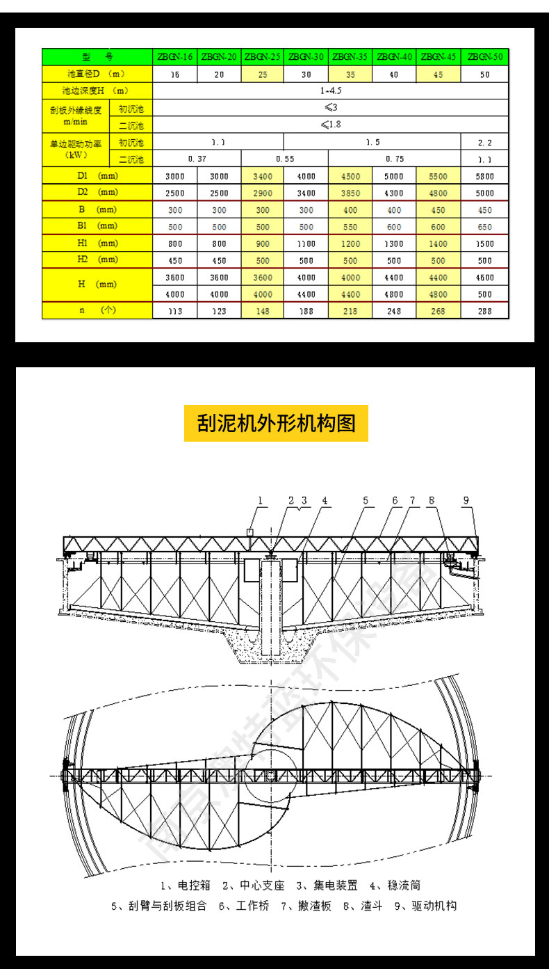 ZBGN 系列刮泥機(jī)如圖 1~2 由主梁、中心支座及集電器、驅(qū)動(dòng)裝置、刮泥板、撇渣裝置、導(dǎo)流筒、排渣斗和控制柜等組成。