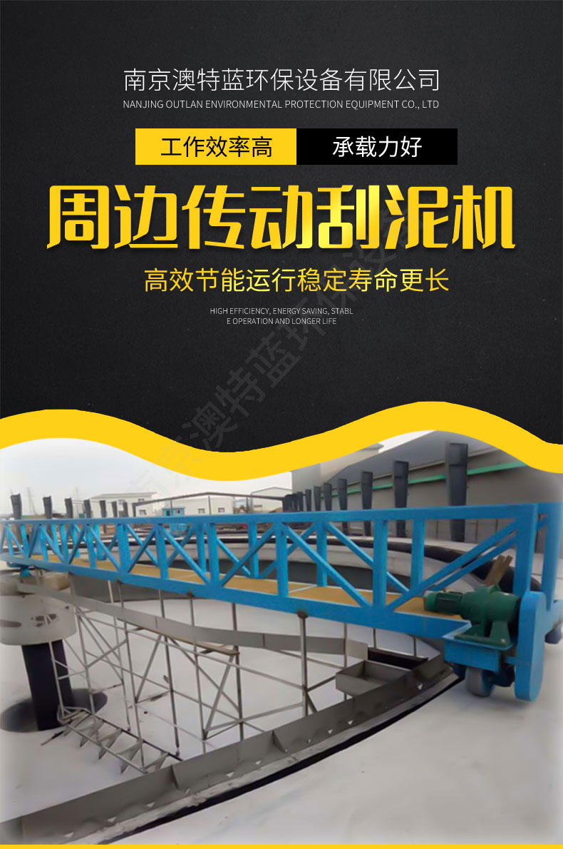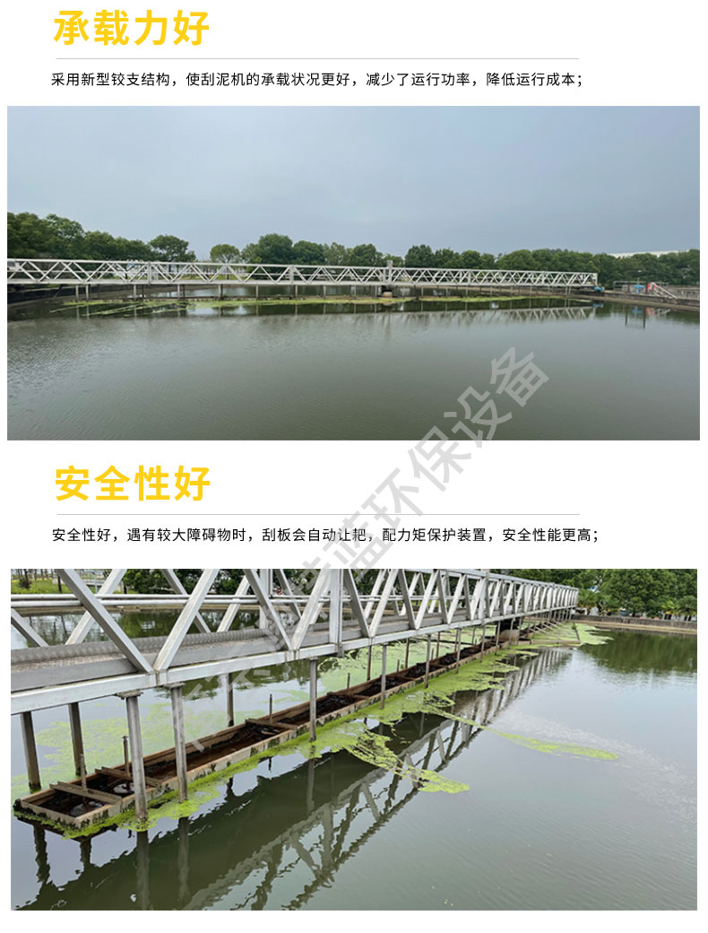 在驅(qū)動(dòng)裝置推動(dòng)下,主梁繞池中心軸線旋轉(zhuǎn),固定于刮臂上的刮板將沉積在池底的污泥刮集至池中心集泥坑。刮板曲線采用對(duì)數(shù)螺線型,受力均勻,刮泥徹底,當(dāng)池底遇有障礙物時(shí),能自動(dòng)讓杷,保護(hù)機(jī)器不受傷害。驅(qū)動(dòng)裝置可設(shè)過扭保護(hù)裝置,工作更加安全。