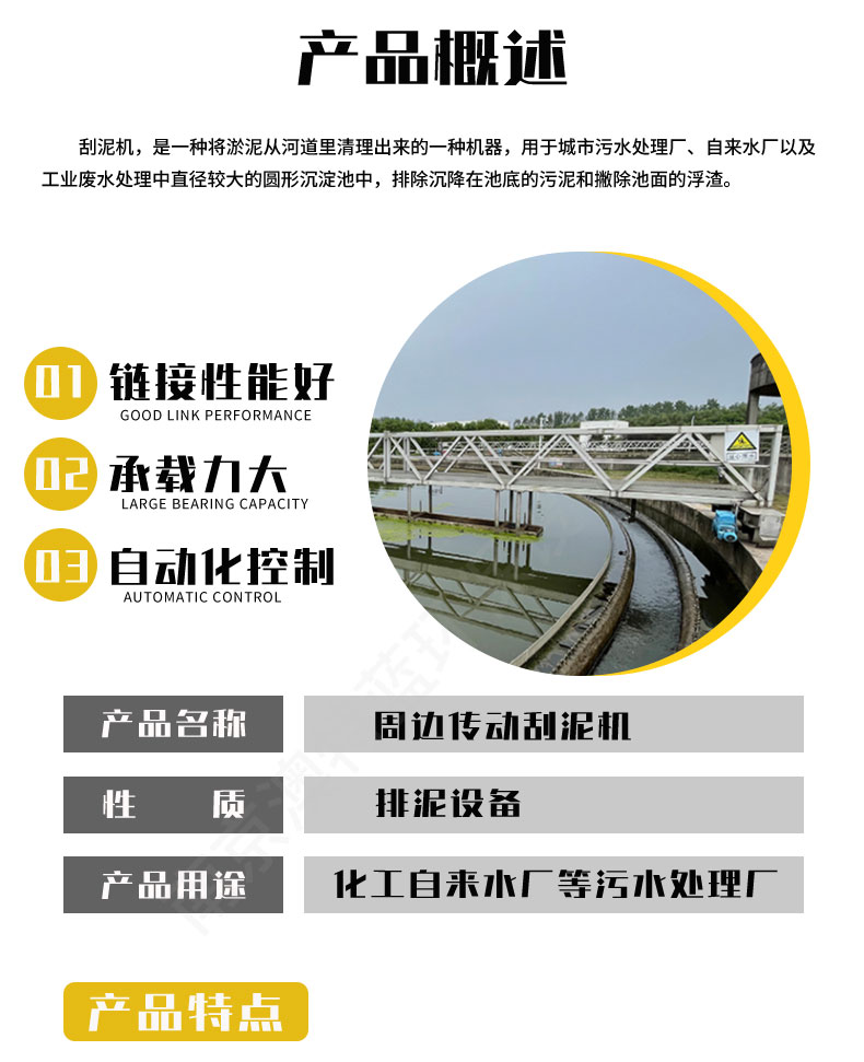 周邊傳動(dòng)橋式刮泥機(jī)ZBGN ZBGN 系列刮泥機(jī)用于污水處理廠圓形沉定池,將沉降在池底的污泥刮集至池底集泥坑并將池面的浮渣救向集渣斗,以便進(jìn)一步處理。